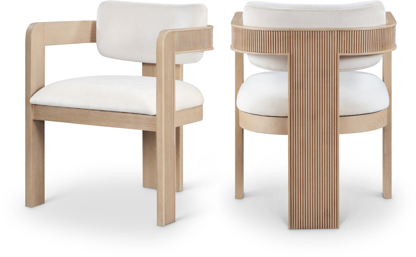 Elevate your counter seating with the Soacha cream velvet upholstered dining chair, a perfect blend of refined texture and timeless craftsmanship. Wrapped in a soft, striking 460 GSM velvet, this chair offers both depth and sophistication. The solid wood frame, finished in a natural tone, showcases elegant fluted detailing, adding a touch of classic artistry.