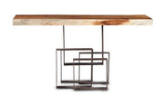 Solid Chamcha Wood tops are paired with rusted metal bases formed by various sized squares. This cool console table is unique and fun.
