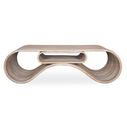 This coffee table is a stunning piece of functional art, crafted entirely from white-washed rattan poles. Its soft, undulating curves create a sense of visual lightness while offering practical storage solutions.
