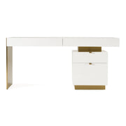 The Tristan Desk is a beautiful, contemporary piece that anchors any room. The white gloss white finish of the cabinets and top contrasts effortlessly with the bright brushed gold stainless steel metal frame. Four soft closing drawers provide a plethora of storage options in this glam desk.