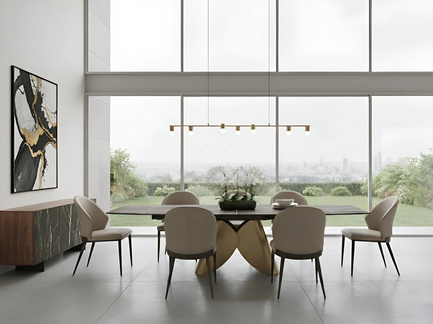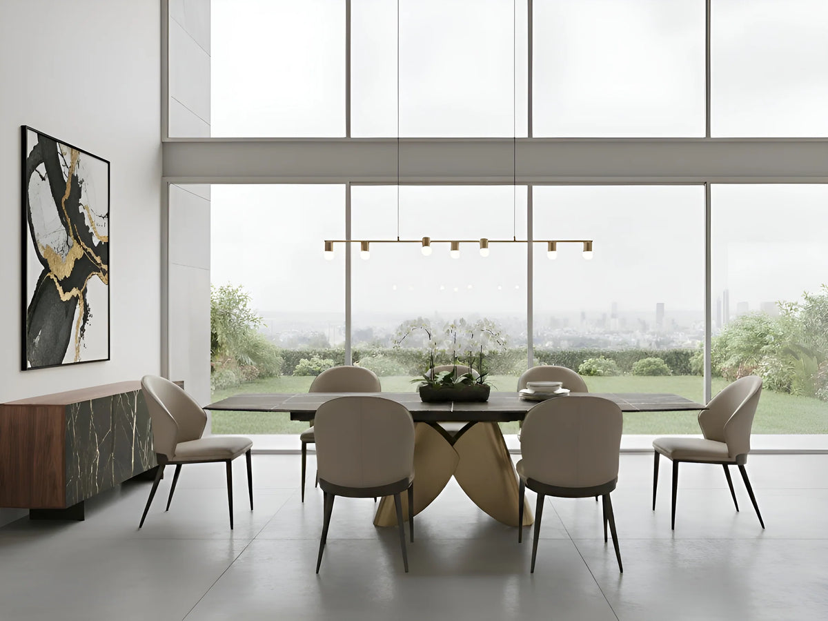 Italia xl extendable dining table with bronze base and rectangular white top offers a blend of adaptable style and comfort...