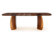 The Riviera Dining Table embodies contemporary elegance with its sleek, rectangular glass top resting on two sculptural cylindrical bases crafted in warm bronze-tinted glass. The bronze glass features a delicate melted texture that catches and reflects light with a soft, fluid glow, bringing depth and artistry to its modern silhouette. Perfect for sophisticated dining rooms or hospitality spaces, the Riviera Dining Table blends timeless design with a touch of luminous warmth.