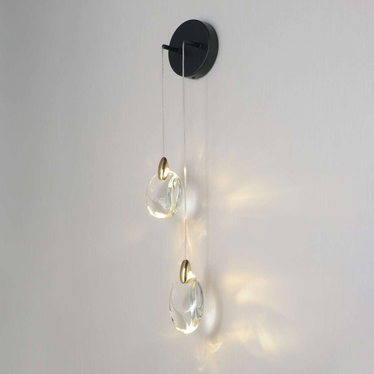 As if naturally formed from the ebbing shores of a riverbed, smooth and irregularly shaped crystal pebbles are suspended by cast metal clasps in a Polished Gold finish. Discreetly illuminated by concealed LED light sources within the clasps, additional downlight originates from LED GU10 lamps housed in a Matte Black canopy adding to the refracting iridescent shimmer on the crystal surface below. Available in multiple configurations of pendants as well as sconce options.