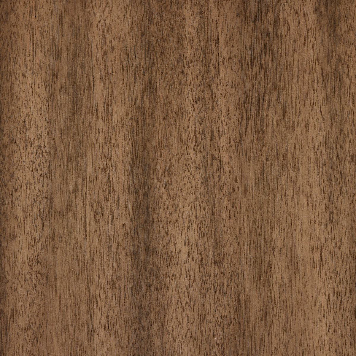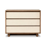 Simply shaped with a ski-leg base, painted linen drawer fronts complement the mahogany case. Three drawers allow for ample storage in this low, modern nightstand.