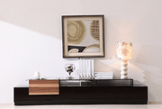 Flo Entertainment TV Center offers a contemporary look with a clean uncluttered design and functional multipurpose structure. It features a large glass top with spacious compartments, a low lying frame, crafted from durable wood, wood products, and veneers. It is available in the Light Walnut mixed with Black High Gloss and Blue Star Grey Glass.