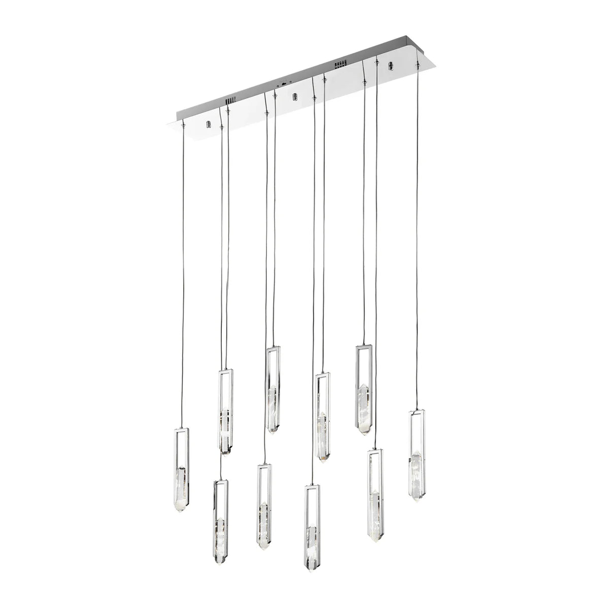 La luminaria, fabricada en metal de alta calidad con un elegante acabado cromado, presenta un aspecto moderno y lujoso. Cada una de las diez luces cuelga elegantemente del dosel, proporcionando un efecto visual impactante y una iluminación abundante.