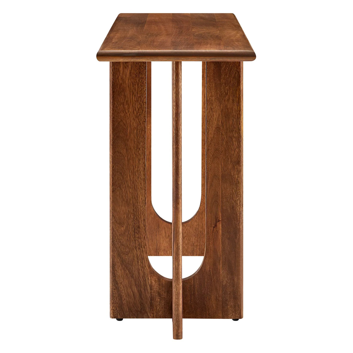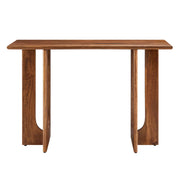 The Rivera 46" Console Table combines mid-century modern elegance with innovative style. Its double pedestal base, featuring arched cutouts in an intersecting design, creates a striking focal point in any room. Made from solid mango wood, this accent console showcases a beautiful 46 inch long tabletop, perfect for complementing living room furniture, hallway decor or entryways. Rivera is not just a statement piece but also a practical addition to your home. An ideal behind the couch table, this sofa table is great for showcasing books, candles or plants, making it perfect for modern home essentials. Equipped with adjustable, non-marking foot caps, the Rivera solid wood console table ensures floor protection and stability. Elevate any space with the Riviera versatile modern console table. Some assembly required. Weight Capacity: 220 lbs.