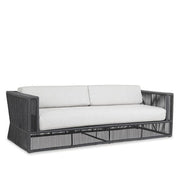 The Milano Sofa embodies clean lines and thoughtful angles, with its powder coated aluminum frame expertly wrapped with premium all-weather olefin rope in a charcoal-grey finish, and features a box frame with pinched back leg detail.